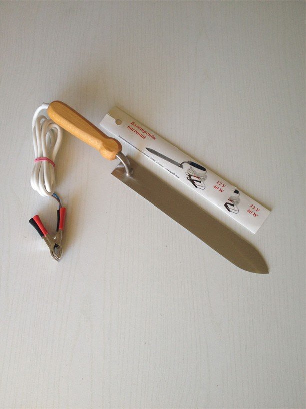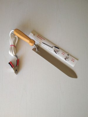 Cutit descapacit electric, 12V, se alimenteaza la acumulatorul masinii (special pentru pastoral) sau la 220 v prin transformator. Este din otel si asigura o temperatura constanta. Este mai productiv decit un cutit apicol simplu. Consta din lama cu un element termic, ce permite incalzite uniforma, miner din lemn vopsit si doua sirme cu cleste. Curent electric constant, 12V.