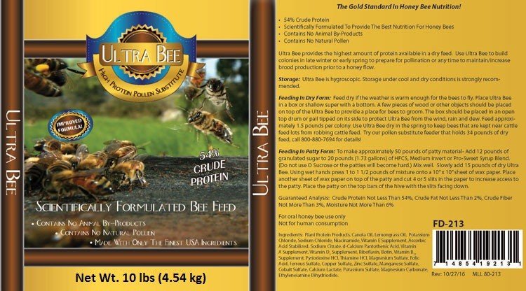 Realizat din cele mai bune ingrediente din SUA, produsul Ultra Bee are un profil complet de aminoacizi, vitamine benefice, lipide si minerale, esentiale dezvoltarii armonioase a familiilor de albine sau roilor naturali si artificiali. Rezultatul administrarii: Rezultatul administrarii produsului Ultra Bee la sfarsitul iernii si inceputul primaverii (dupa zborul de curatire) este cresterea exploziva a cantitatii de puiet si generarea unei stari bune de sanatate in familia de albine. Administrarea de supliment proteic Ultra Bee la sfarsitul verii si inceputul toamnei, conduce la efecte benefice. In timpul sezonului activ este benefica atunci cand sursa de polen este scazuta sau inexistenta. Spre sfarsitul verii este recomandat a se administra doar in hraniri de stimulare (200-500 ml familia de albine), iar toamna este recomandata administrarea produsului in sirop sau turta tot in cantitati mici pana cand albina poate efctua zboruri. Astfel productia de miere este cu mult marita.