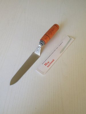 Отличается тонким лезвием - 0,8 мм, новым видом крепления кронштейна ручки. Такой нож имеет отличные режущие характеристики, хорошо затачивается, удобен в работе. Новая система крепления гарантирует прочность лезвия в точках сгиба, достаточную толщину кронштейна и прочность посадки ручки.