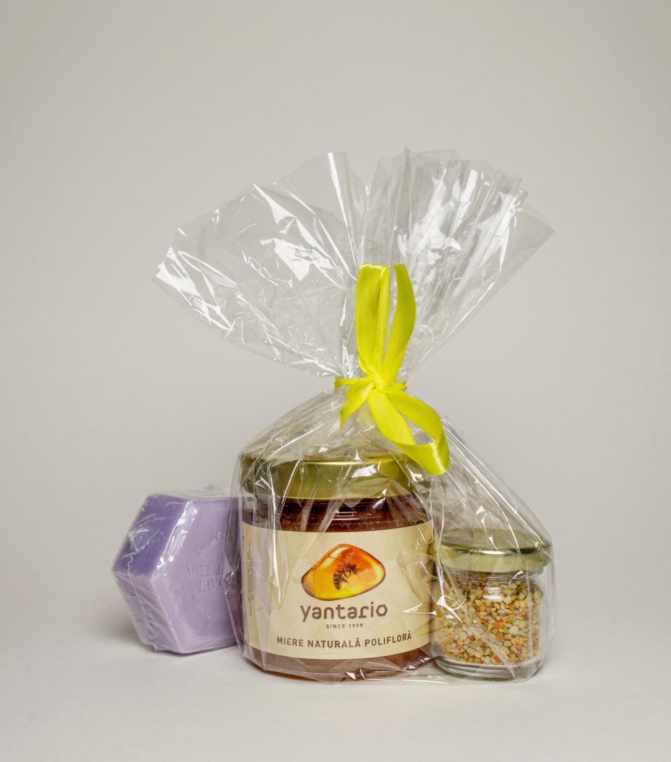 1 баночку 300 грамм натурального цветочного мёда, 1 баночку 20 грамм цветочной пыльцы и мыло медовое.