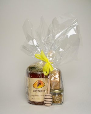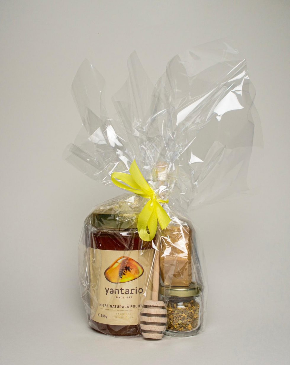 1 баночку 500 грамм натурального цветочного мёда, 1 баночку 20 грамм цветочной пыльцы, мыло медовое и ложечку для мёда.