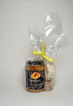 1 баночку 500 грамм натурального акациевого мёда, 1 баночку 20 грамм цветочной пыльцы, мыло медовое, ложечку для мёда и ёлочную игрушку.