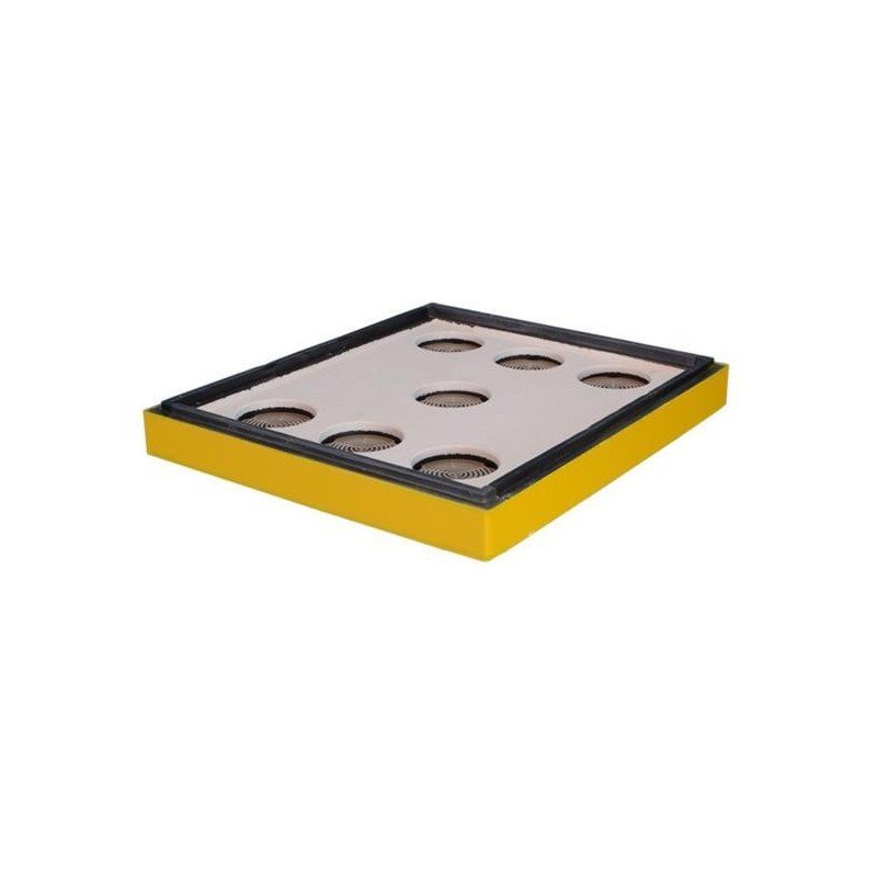 Эта плоская плита с утолщенными краями и семью отверстиями обычно устанавливается под крышей улья. Перегородка является очень важным элементом улья, т.к. с её помощью осуществляется регулировка вентиляции гнезда. Отверстия перегородки вставляются круглые пластиковые решетки, через которые пчела пройти не может, а регулировка вентиляции осуществляется с помощью глухих пенополистирольных заглушек, закрывая которыми все или часть отверстий можно регулировать вентиляцию улья. Через эти отверстия можно так же осуществлять подкормку пчел из обычных банок. Диаметр отверстия позволяет поставить в него перевернутую банку с сиропом, в крышке которой предварительно надо сделать несколько отверстий. Таким же образом можно давать пчелам воду ранней весной. Если одно из отверстий полностью открыть, то на перегородку можно ставить любые надрамочные кормушки. Размещенные в отверстиях решетки сделаны из мягкого пластика. Через какое-то время пчелы заполняют их прополисом. Положите решетки в морозильник, а после того, как прополис замерзнет, изогните решетку. Прополис осыплется сам. Таким образом можно получать чистый прополис с минимальными трудозатратами. С помощью перегородки легко формировать отводок на том же улье, но с летком повернутым в другую сторону. Перегородку можно использовать как пчелоудалитель закрепив под одним из отверстий пчелоудалитель типа «Квебек» (в этом случае пластиковую решетку из отверстия надо убрать). В ульях оборудованных перегородками не надо использовать ни холстики, ни подушки. Перегородка заменяет собой оба этих элемента. Вы можете найти и другие способы применения этого полезного приспособления.