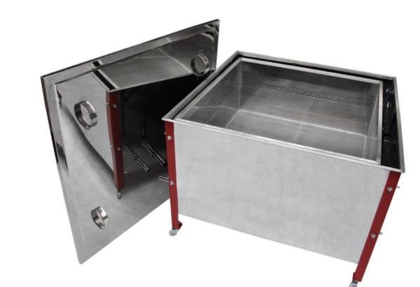Это оборудование предназначено для получения воска из рамок или сотов при помощи пара. Оно состоит из внешнего контейнера (в котором находится вода) и корзины для рамок и сотов. Также имеется газовый табурет для подогрева воды.